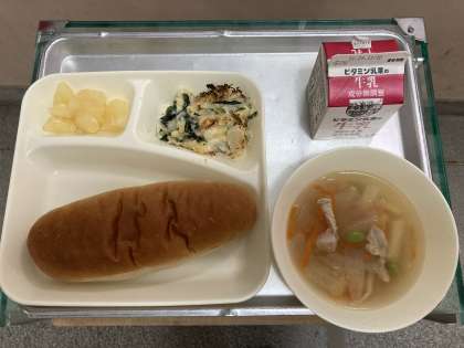 ほたて貝のグラタン・スープ・パインアップル(カット缶)・黒糖パン・牛乳です。