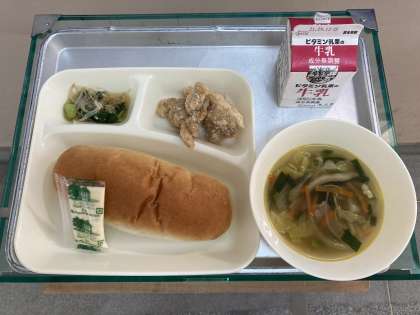 鶏肉のからあげ・中華スープ・チンゲンサイともやしの甘酢あえ・