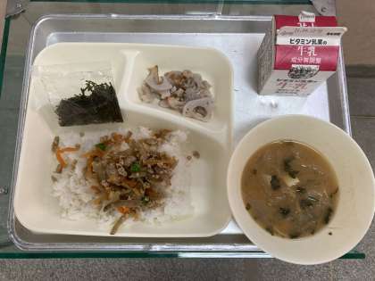 鶏ごぼうご飯・みそ汁・焼きれんこん・ご飯・牛乳です。