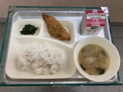 たらフライ・うすくず汁・ほうれんそうのおひたし・ご飯・牛乳です。