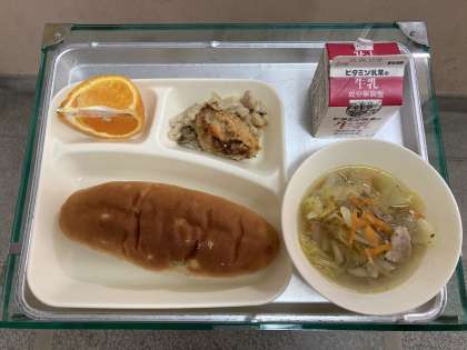 押麦のグラタン・豚肉と野菜のスープ・デコポン・おさつパン・牛乳