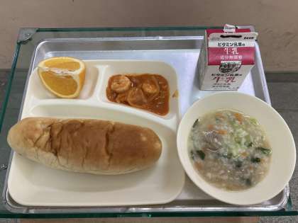えびのチリソースいため・中華がゆ・はっさく・おさつパン・牛乳です。