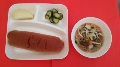 今日の献立は、「肉うどん」「きゅうりの甘酢づけ」「りんご」「黒糖パン」「牛乳」です。
