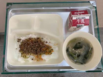 今日の給食のビビンバの具はコチジャンで味付けしたひき肉ときゅうり、にんじん、切干しだいこん使ったナムルです。