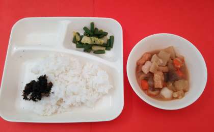 今日の献立は、「関東煮」「三度豆のからしあえ」「のりのつくだ煮」「ごはん」「牛乳」です。