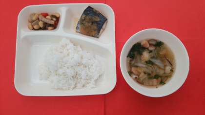 今日の献立は、「さごしのおろしじょうゆかけ」「すまし汁」「五目豆」「ごはん」「牛乳」です。