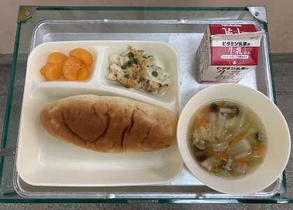 マカロニグラタン・キャベツのスープ・みかん(缶)・おさつパン・