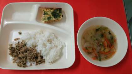 今日の献立は、「千草焼き」「すまし汁」「ツナっ葉いため」「ごはん」「牛乳」です。