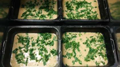 「千草焼き」は、平成24年度以来、久しぶりの登場です。いためた鶏挽肉、とうふなどを卵にまぜ、ミニバットに入れて、焼き物機で焼きます。(写真2枚目、焼く前・写真3枚目、焼き上がり後)