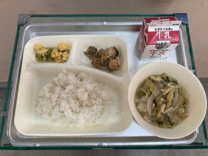 今日の給食では、さやから出したえんどうを卵とじにしていただきました。