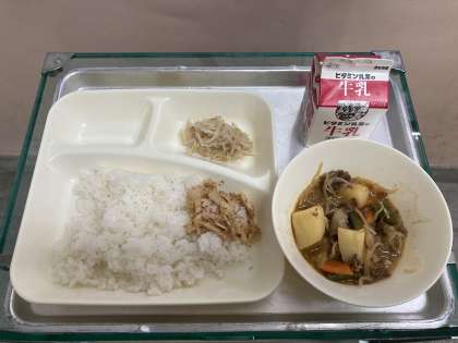みそ肉じゃが・もやしの甘酢あえ・ごまかかいため・ご飯・牛乳です。