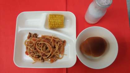今日の献立は、「きのこのスパゲッティ」「焼きとうもろこし」「黒糖クレセントロールパン」「牛乳」です。