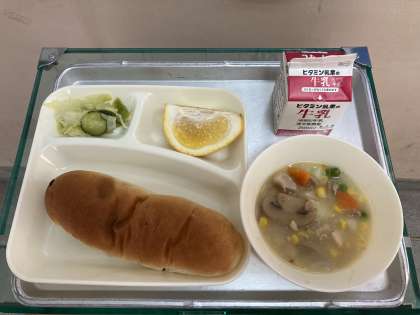 鶏肉とコーンのシチュー・キャベツときゅうりのサラダ・かわちばんかん・レーズンパン・牛乳です。