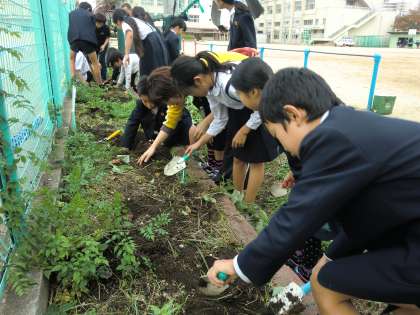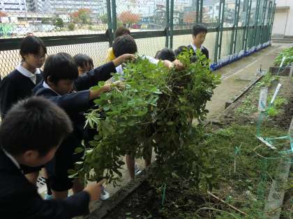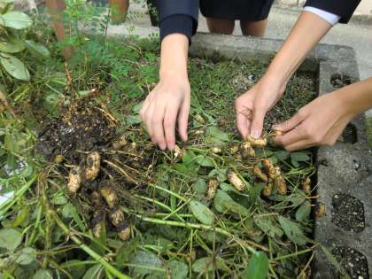 落花生 サツマイモ 柿など 学校にある秋の味覚を収穫しました。落花生は土の中に実ができます。このように葉がついたままの落花生を見ることが初めてという児童も多く、貴重な体験となりました。塩ゆでして食べるととてもおいしいです。