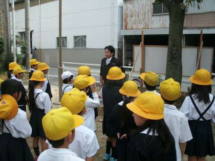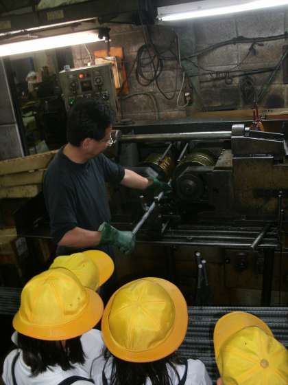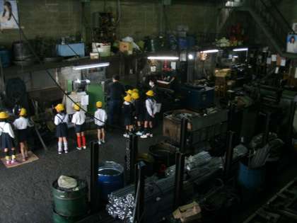 ネジを作っている工場を見学しました。子どもたちは機械のすぐそばまで行くことができ、とてもよく見ることができました。太い鉄の棒を削ったり曲げたりして、大きなネジができます。見学の後、社長の増永さんにたくさんの質問をしました。「工場ができたのはいつですか。」「一番大きなネジはどのくらいの大きさですか。」などの質問に一つ一つ丁寧に答えていただきました。作られたネジは日本全国に運ばれて使われているそうです。今日見せていただいたネジは、高速道路の壁などに使われているそうです。