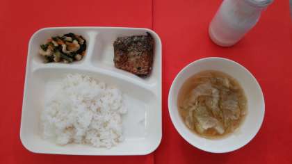今日の献立は、「インド風さばのさくさくあげ」「すまし汁」「こまつなとあげの煮もの」「ごはん」「牛乳」です。
