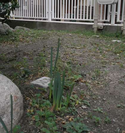 玄関の植え込みにスーとした芽が出てきました。