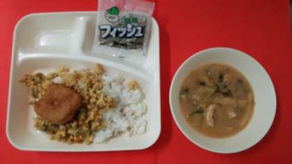 今日の献立は、「カツ丼」「みそ汁」「ミニフィッシュ」「牛乳」です。