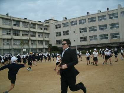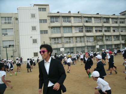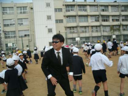 「前半のハンターを紹介します!」の声に、「わあーぁ!」・・・運動場中が沸きに沸きました。朝会台前に整列したハンター役の先生達。背広もサングラスもきまっています。