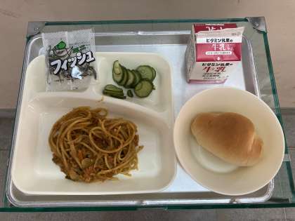 カレースパゲッティ・きゅうりのピクルス・ミニフィッシュ・ミニコッペパン・牛乳です。