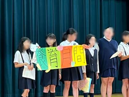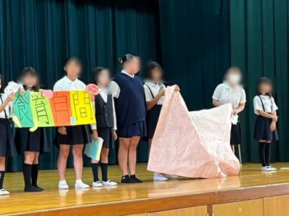 今日の朝会で、給食委員会の皆さんが食育月間の発表をしました。