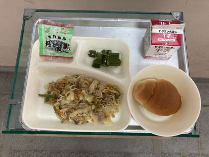 和風焼きそば・オクラの甘酢あえ・ソフト黒豆・ミニロールパン・牛乳