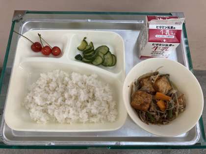牛肉と野菜のいため煮・きゅうりのしょうがづけ・さくらんぼ・ご飯・牛乳です。