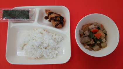 今日の献立は、「まぐろのフライ」「鶏肉とあつあげの煮もの」「焼きのり」「ごはん」「牛乳」です。