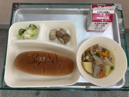 鶏肉のバジル焼き・ベーコンと野菜のスープ煮・キャベツときゅうりのサラダ・黒糖パン・牛乳です。