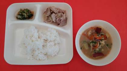 「豚肉のしょうが焼き」は、しょうが風味が効いた子どもたちに好評な献立です。「さつまいものみそ汁」は、さつまいも、うすあげ、にんじん、もやし、青ねぎ、えのきたけが入った具だくさんのみそ汁です。「きくなとはくさいのごまあえ」は、旬のきくなとはくさいを使用しています。