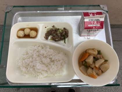 月見の行事献立としていもを使った「一口がんもとさといものみそ煮」、だんごを使った「みたらしだんご」が出ます。