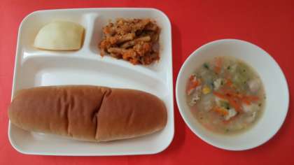今日の献立は、「ミートグラタン」「コーンスープ」「りんご」「黒糖パン」「牛乳」です。