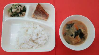 今日の献立は、「赤魚のしょうゆだれかけ」「みそ汁」「おおさかしろなのいためもの」「ごはん」「牛乳」です。
