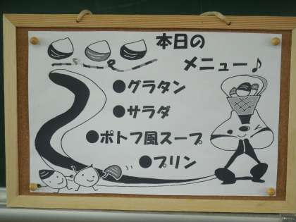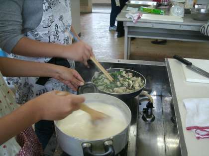 今日のメインディッシュはのグラタンです。ホワイトソースから作りました。バターを溶かして、小麦粉を焦がさないように火をとおし、牛乳を入れて…。どの班もなかなかの腕前です。もう一つのコンロでは、具を炒めます。オーブントースターで焼きました。付け合せにサラダとコンソメ味のポトフ風スープを作りました。