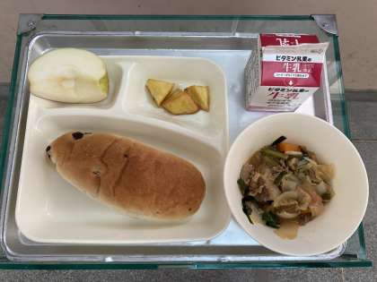 中華煮・大学いも・りんご・レーズンパン・牛乳です。