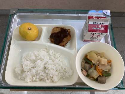 みそカツ・じゃがいもと野菜の煮もの・みかん・ご飯・牛乳です。