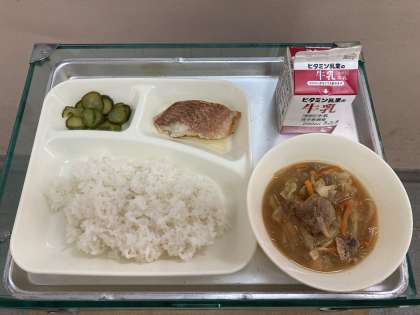 あかうおのしょうゆだれかけ・豚汁・きゅうりのゆず風味・ご飯・牛乳です。