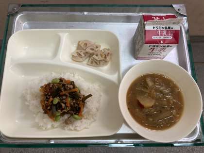 給食のジューシーは、豚ひき肉、にんじん、むきえだまめ、もずく、切りこんぶなどを使い、豚骨スープでうま味を増した具をご飯と混ぜ合わせていただきます。