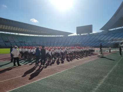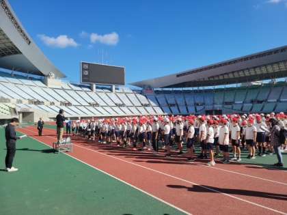 今日は6年生がヤンマースタジアム長居で、浪速区の小学校と一緒にスポーツ交歓会に参加しています。