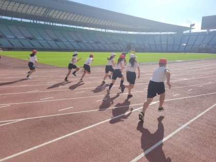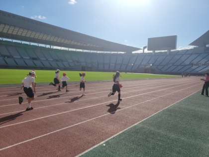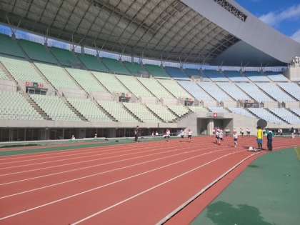 いい天気の中、素晴らしい競技場で子どもたちは真剣に走っています。