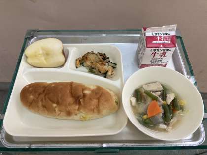 ほうれんそうのグラタン・スープ煮・りんご・おさつパン・牛乳です。