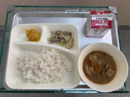 豚肉と野菜のいためもの・いわしのつみれ汁・かぼちゃういろう・ご飯・牛乳です。