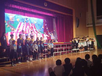 1年生は、「せかいはひとつ」です。キラキラ星の歌と合奏でした。