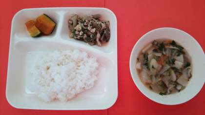 今日の献立は、「豚肉と干しずいきのみそ煮」「うすくず汁」「焼きかぼちゃ」「ごはん」「牛乳」です。