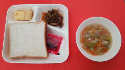 今日の献立は、「牛肉のケチャップソテー」「はくさいのスープ」「焼きプリン」「食パン」「牛乳」です。