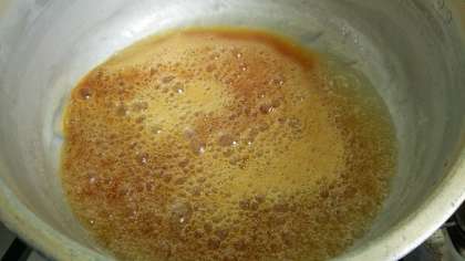 「焼きプリン」は、カラメルソースから手作りします。砂糖、水を合わせて褐色になるまでしっかり煮つめて作ります。(写真2枚目)ミニバットに入れて1クラス分ずつ焼きます。(写真3枚目)