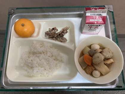 今日の給食では鶏肉、うずら卵、ごぼう平天、じゃがいも、こんにゃく、あつあげ、だいこん、にんじんを使用しています。