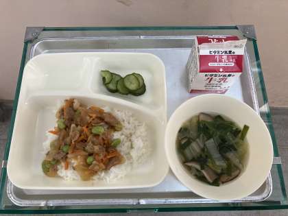 ピリ辛丼・中華スープ・きゅうりの甘酢づけ・牛乳です。