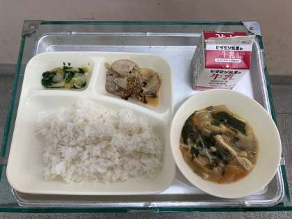 豚肉のごまだれ焼き・みそ汁・きくなとはくさいのおひたし・ご飯・牛乳です。