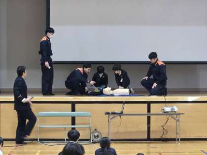 4.5.6年生は、消防署の方から救助についての講習を受けました。心肺蘇生の大切さとその方法について教わり、「あっぱくん」というツールをつかって心臓マッサージの練習をしました。